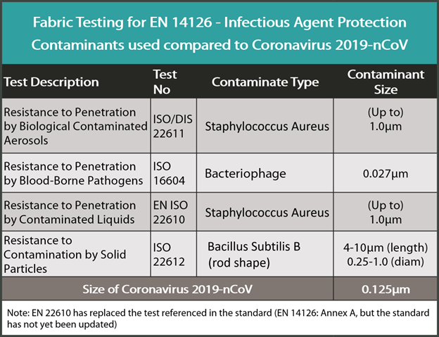 Chứng nhận EN 14126 (xem hình ảnh bên dưới) không giải thích loại tác nhân truyền nhiễm phù hợp để bảo vệ chống lại. Truyền nhiễm virus và vi khuẩn lây truyền khác nhau và có các con đường lây nhiễm khác nhau. Tiêu chuẩn chứa cho các thử nghiệm, mỗi thử nghiệm đo khả năng chống lại các loại ô nhiễm. (Xem bảng ở cuối blog này).