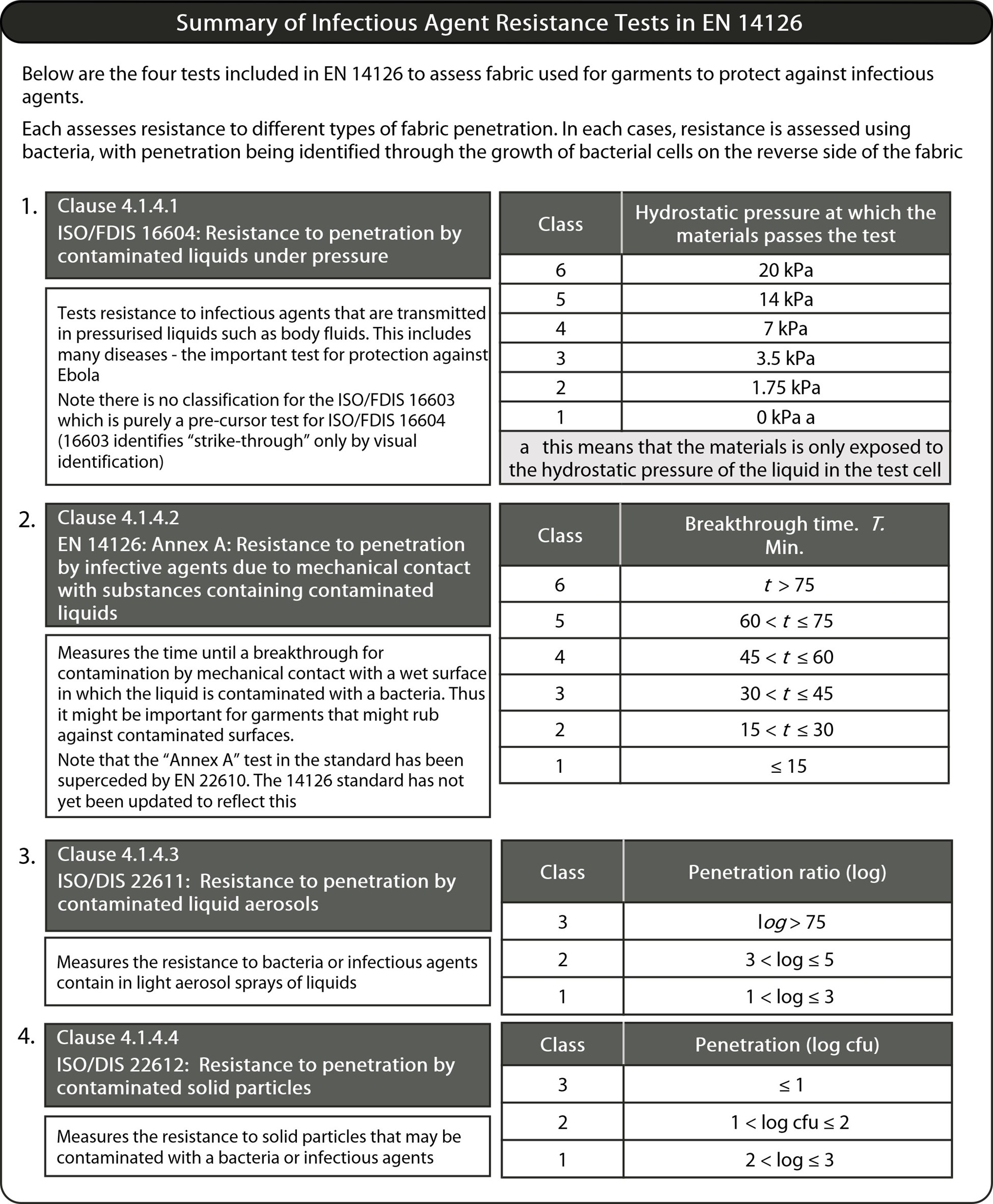 Tiêu chuẩn EN 14126 chỉ chứa BỐN bài kiểm tra - không phải năm như một số nhà sản xuất đề xuất. Một tuyên bố phổ biến của một số nhà sản xuất và nhà cung cấp là hàng may mặc của họ phù hợp vì nó đạt được phân loại trong ISO 16603. Điều này là không chính xác; không có phân loại trong tiêu chuẩn cho kết quả thử nghiệm ISO 16603 và ISO 16603 là thử nghiệm kém hơn so với 16604: nó không nhằm chỉ ra bất kỳ mức độ bảo vệ nào.